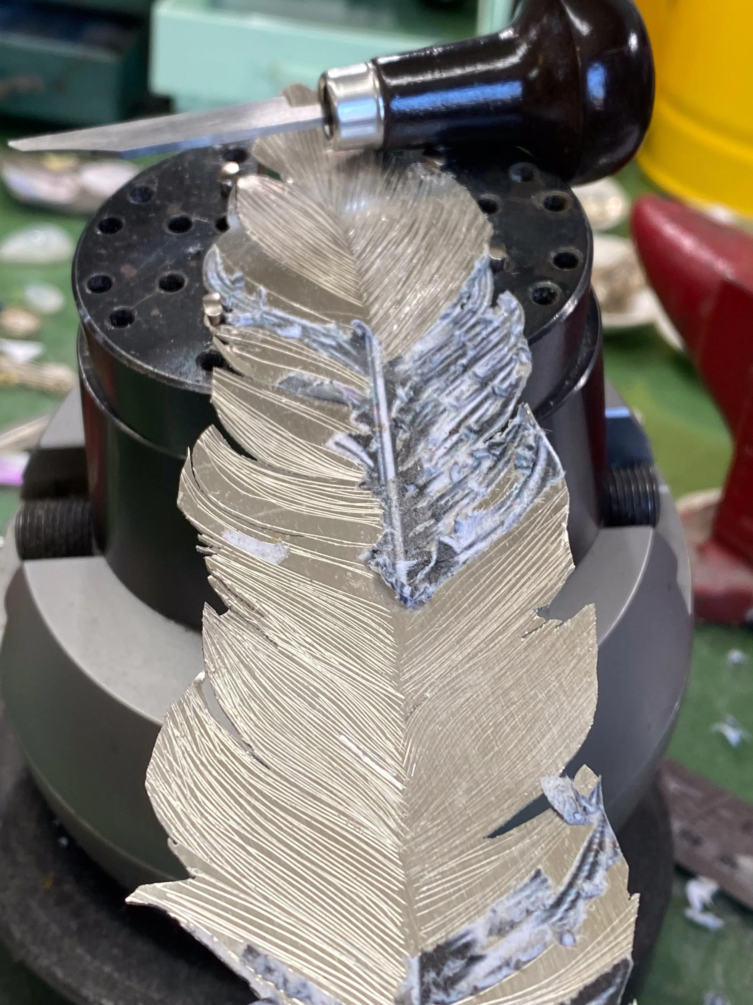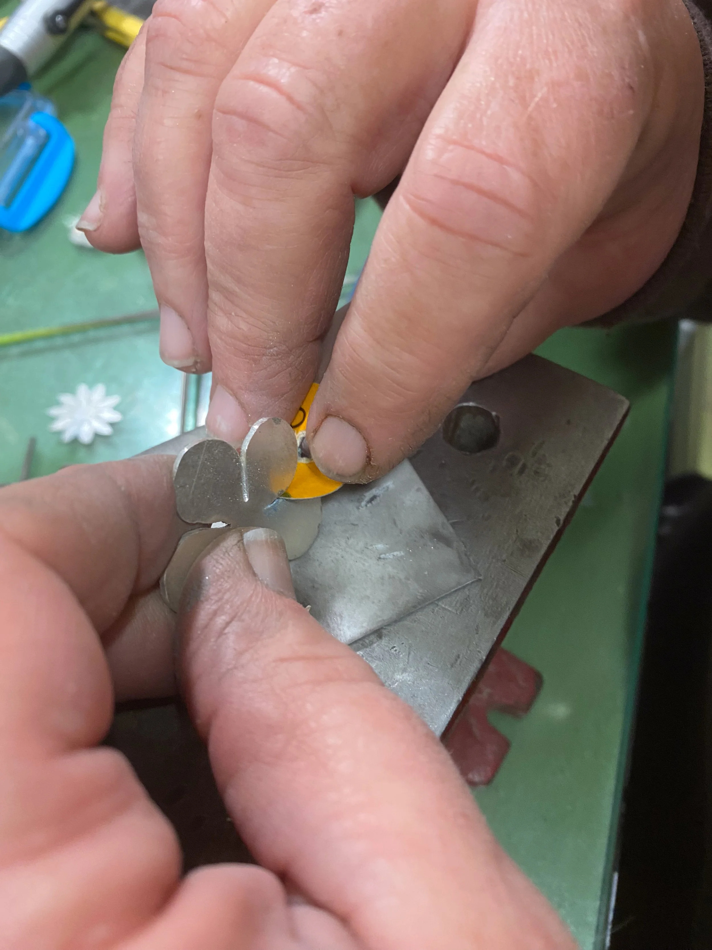 I often will take a leaf (such as the Dandelion leaf here) flower or blossom and glue it directly onto silver. Each component is sawed out from the silver using very small saw blades.